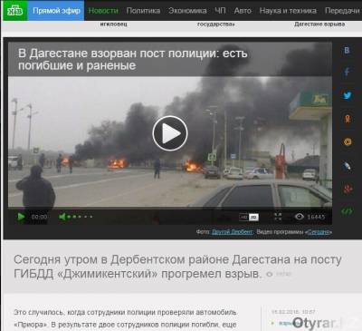 Официальный источник — сайт телеканала NTV, используя это же видео, 15 февраля рассказал о взрыве на посту ГИБДД «Джемикентский» Дербентского района Дагестана.