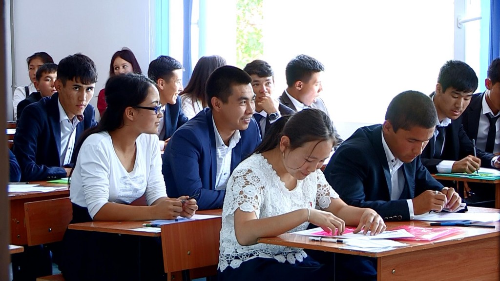 На территории университета Мардана Сапарбаева, в 9 аудиториях будут стараться получить путевку в жизнь старшеклассники, а их «болельщики» — родители, ожидают снаружи. Для их удобства здесь висят два монитора.